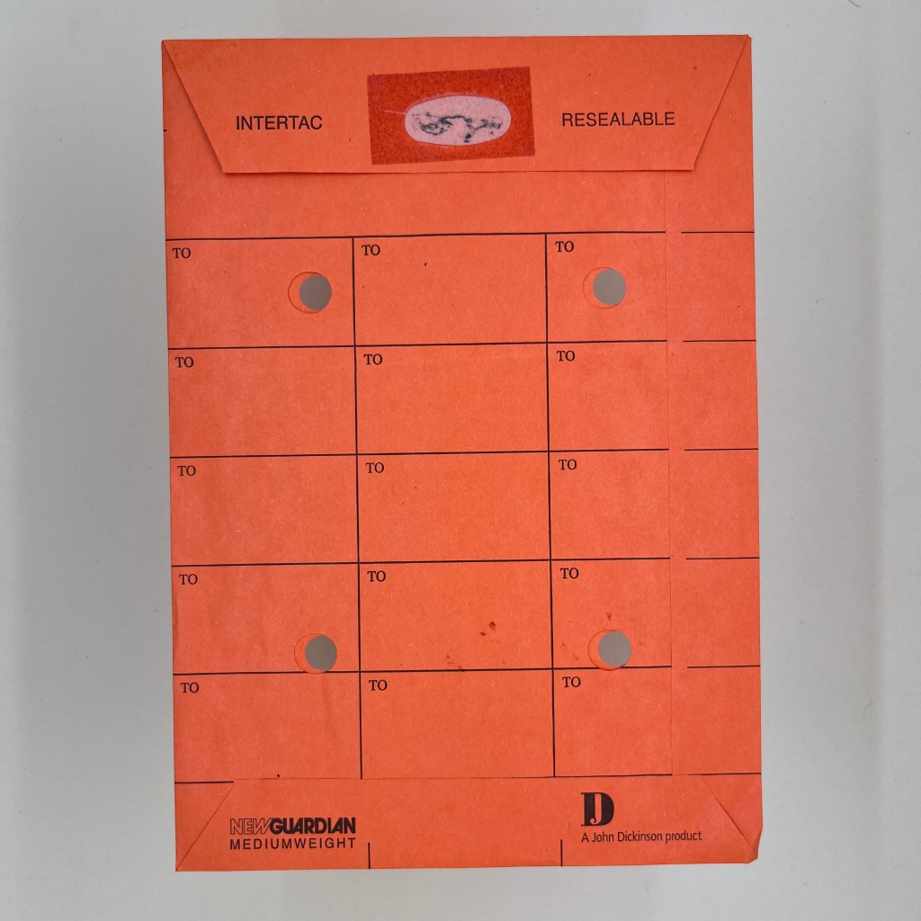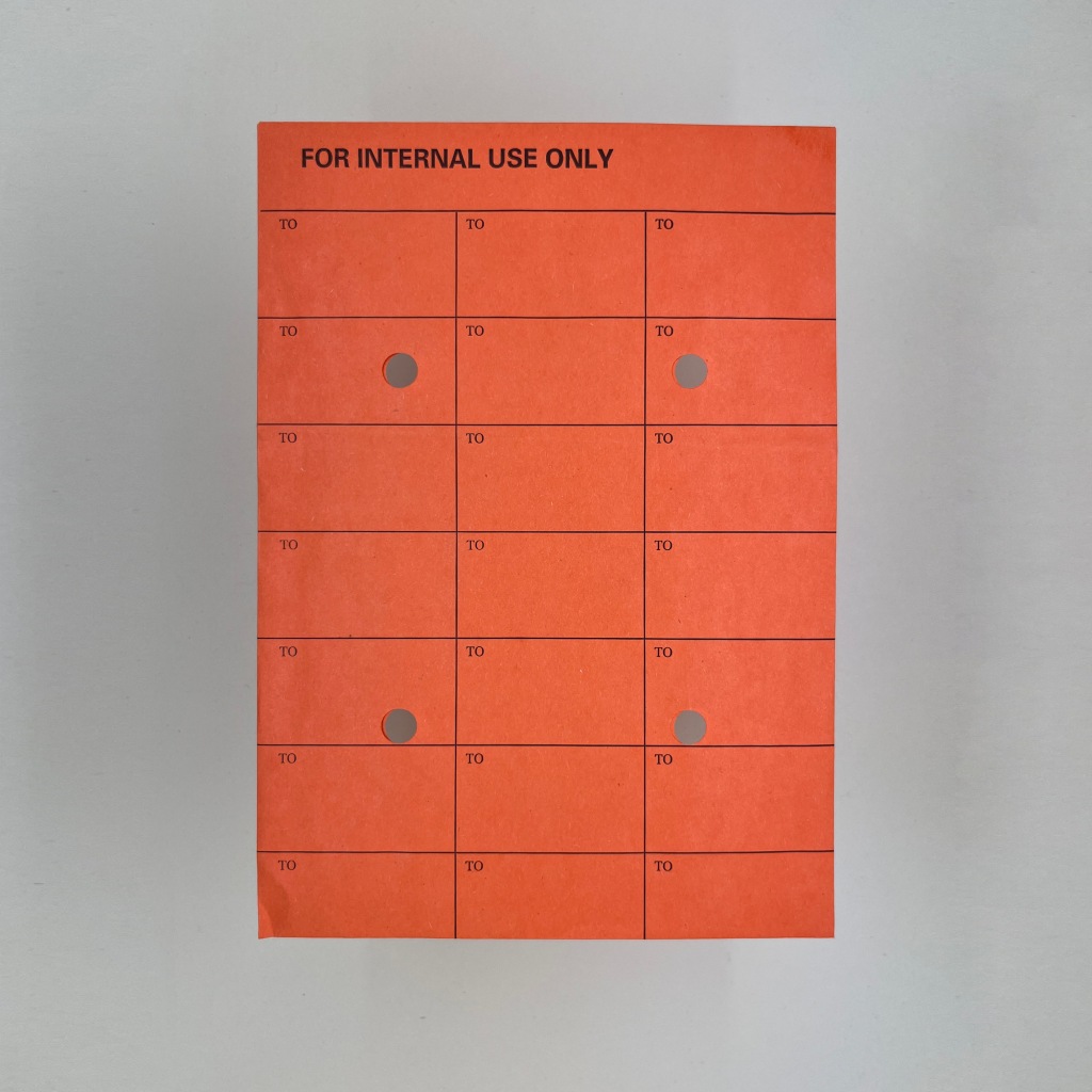 I think I found this in the recycling at an old shared studio space. It's a bit like a physical version of Slack. A method of sending internal messages and threads of information to colleagues. Perhaps with it being resealable and with the little holes in it's more of a public group than a private one.