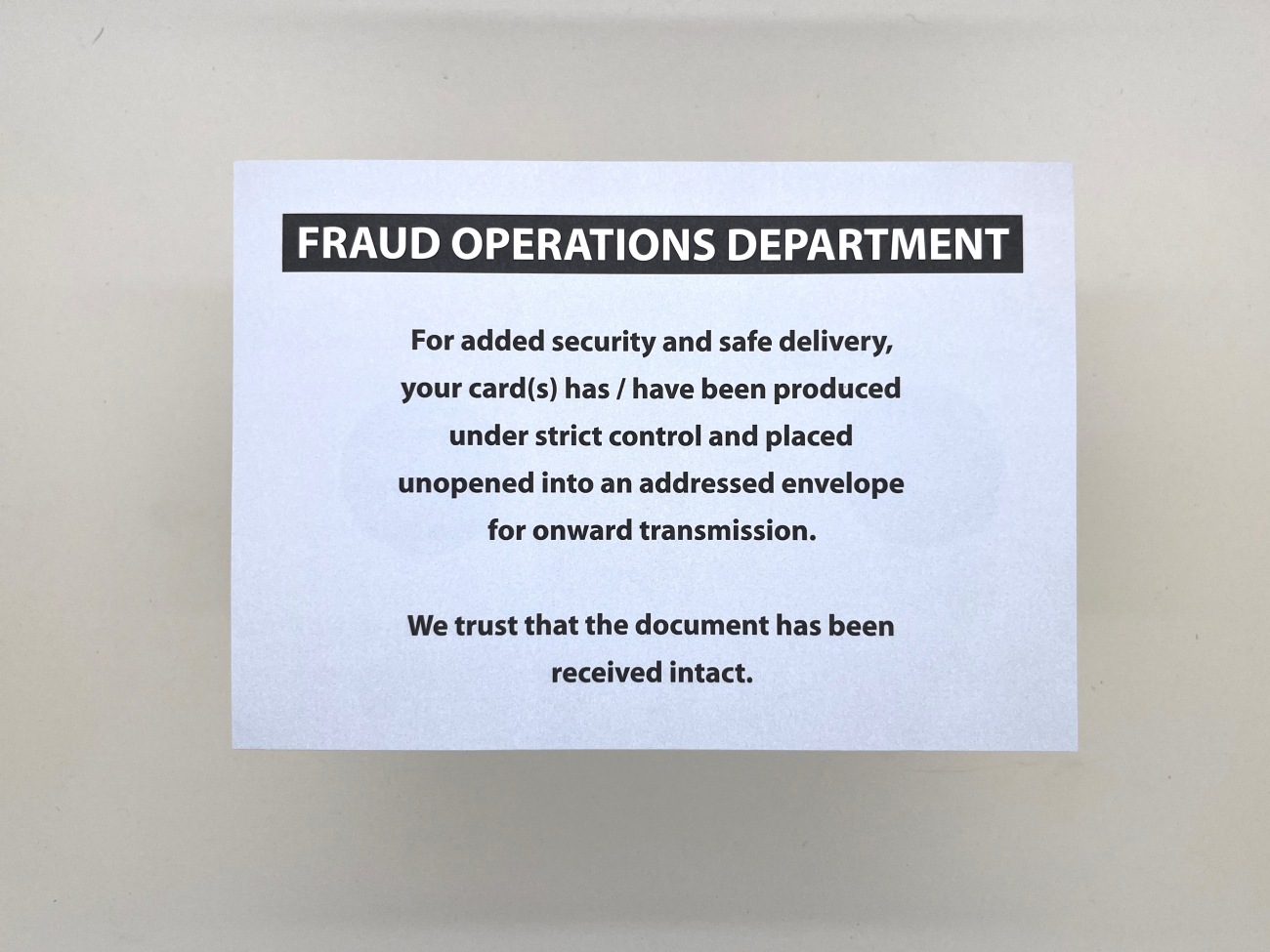 This arrived with another one. This one feels sooo spammy though with it's all caps 'FRAUD OPERATIONS DEPARTMENT' masthead. And less caring in the way it phrases 'We trust that the document has been received intact.' Feels pedantic almost.