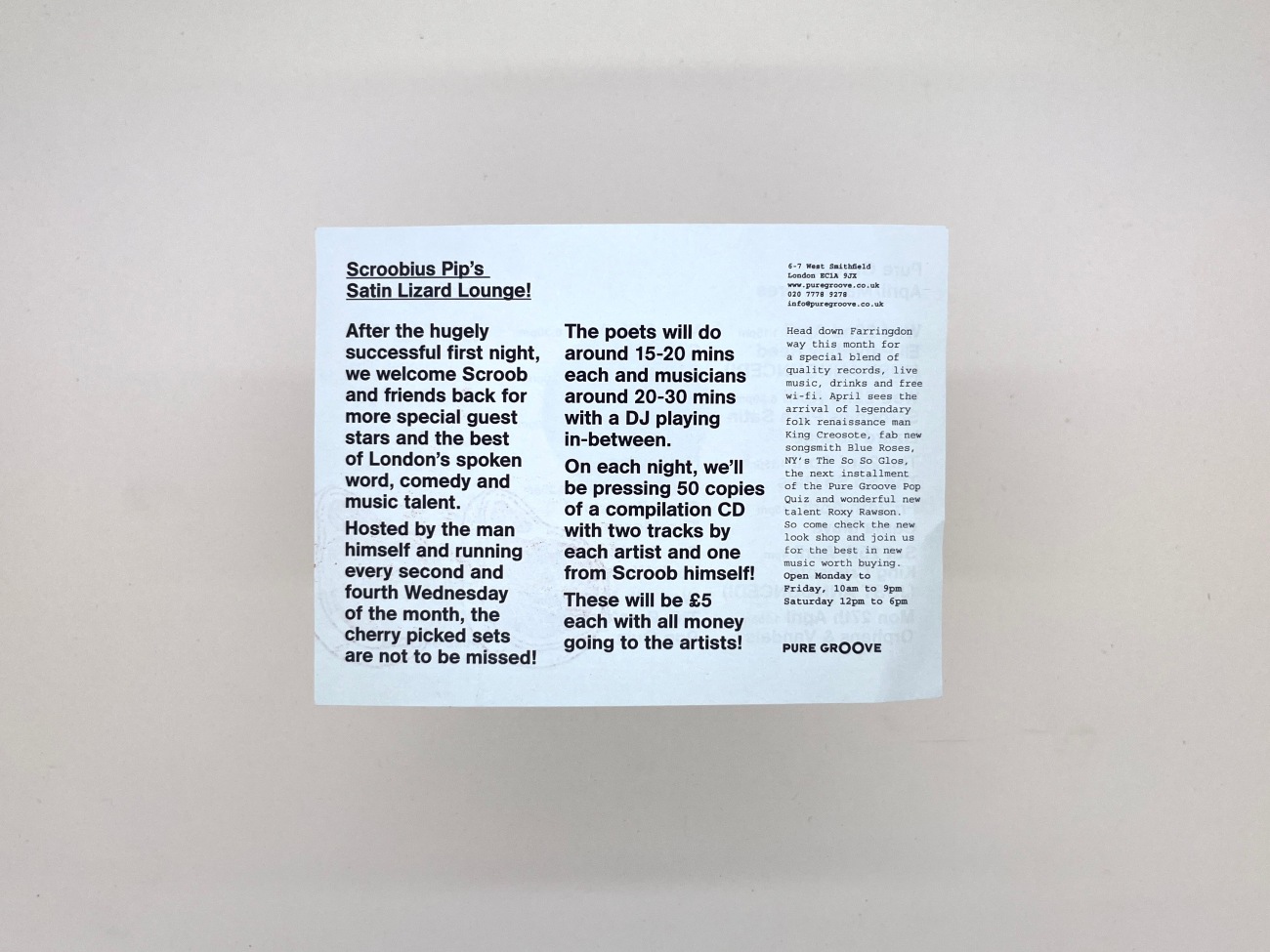 I'm a sucker for pale duotone, stamps, grids, and pairings of courier and sans serif. While I didn't go to this night then, I saved the lovely flyer. Can't remember when it was from, but judging by the age of the collection box this was part of, and the £5 limited edition CD give away, it was mid 2000s. I half wondered if I'd find the night on the Pure Groove Soundcloud, but no.